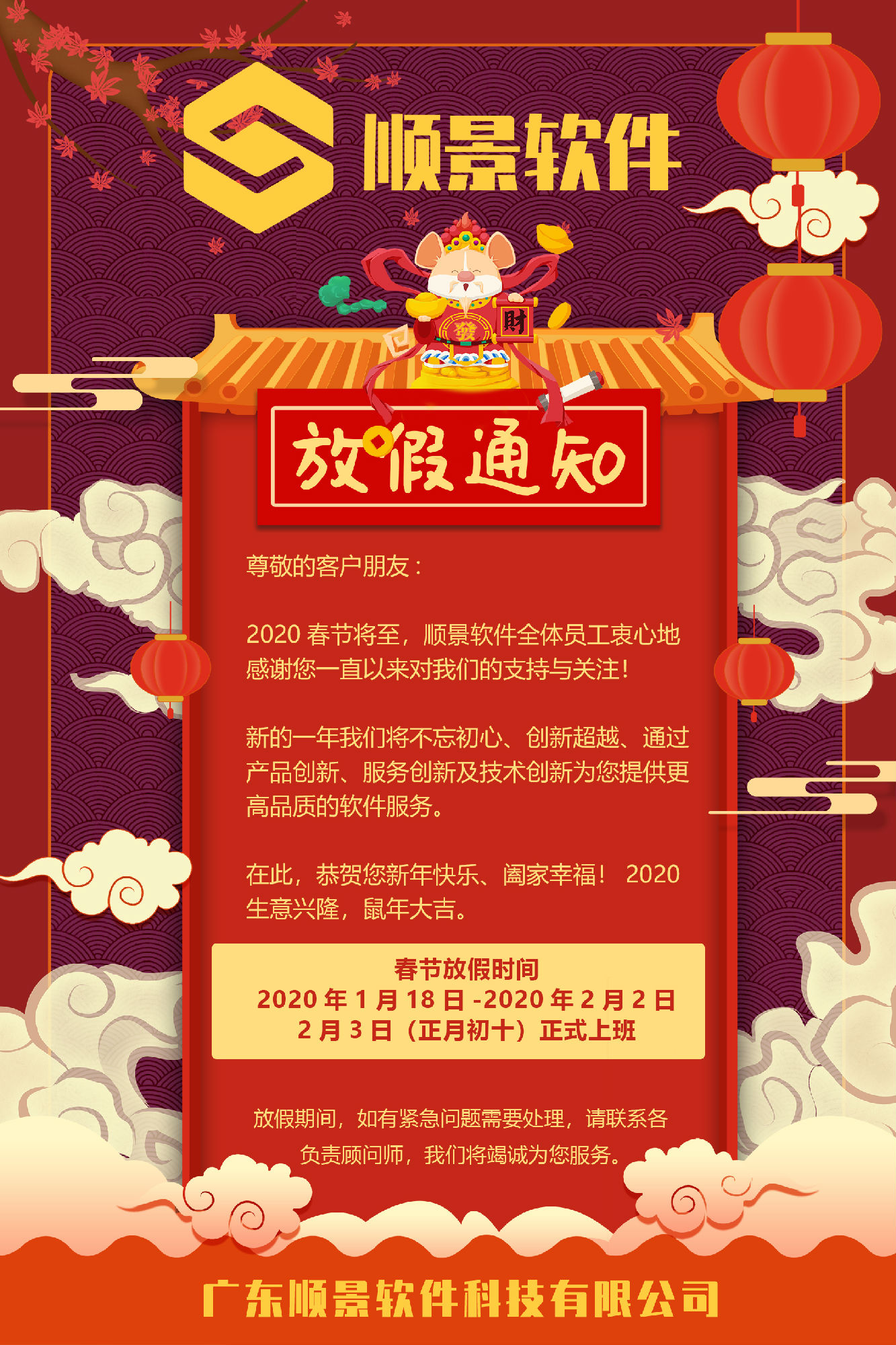 您好,2020年春节假期临近,感谢您一直以来对顺景软件的陪伴与支持,提前祝您新春快乐!